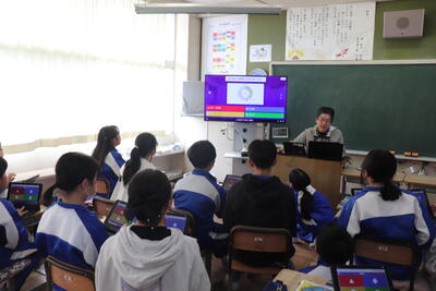 社会の授業では、Kahoot!というアプリを使用して復習問題に取り組みました。日本の周りの沿岸を流れる海流の名前や漁業の種類等、日本の地理に関する問題4択に挑戦していました。クイズ形式でしたが、習っていても忘れてしまった用語は、よく確認をしてほしいと思います。