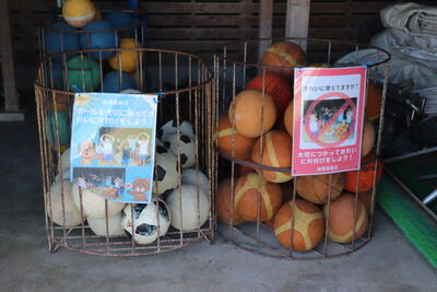 体育委員会がボールの使い方について全校児童に呼びかけるポスターを作成し、ボール籠につけて啓発運動をしていたので紹介します。