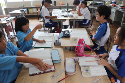 国語の授業では、引き続き「一つの花」について学習しました。今日は題名である、「『一つの花』とは何をあらわしているか」ということを個人やグループに分かれて考えたことを発表しました。「コスモスの花はお父さん」、「一口、一握りの食べ物がほしい」等、みんなで意見を共有しました。児童の発表を聞いていて、しっかりと考えていて素晴らしいと感じました。