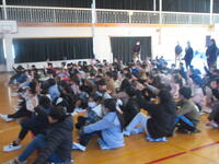 6年生が、体育館で、書初めの練習をしていました。今年度の題材は、「新春の朝」です。ポイントを教えてもらった後、みんな集中して練習に取り組んでいました。