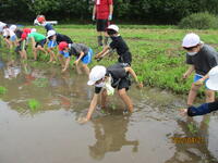 今年度初めて「田植え体験」をしました。近所の方から田んぼをお借りし、米作りを体験させていただきます。今日は、いつも学校の敷地の草刈りや植木の剪定をボランティアで行ってくださっている「西地区 友の会」の方々が田んぼの先生に変身です。初めて田んぼに入る子がほとんどで、苗を見るのも初めて、初めて尽くしの貴重な体験をさせていただきました。「西地区 友の会」の皆様、本当にありがとうございました。
