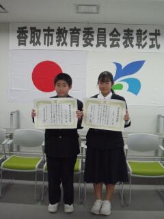 1月22日(木)香取市役所において「令和7年度香取市教育委員会表彰式」が行われました。本校からは、市長特別表彰として、土砂防災防止に関する絵画中学生の部の「最優秀賞(国土交通大臣賞)」を受賞した久保木千尋さん、教育委員会表彰として「全国治水砂防協会千葉県支部長賞」を受賞した宇井惠壱朗さんが出席し、久保木千尋さんが受賞者代表あいさつを行いました。