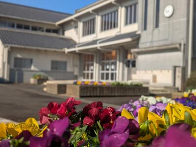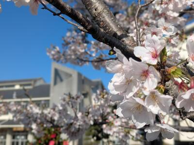 4月3日、久しぶりに晴れ間が広がりました。校庭や通学路では春の花々が彩りを添え、桜は散り始めながらも、まだ美しい姿を見せています。