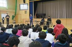 オリパラ教育の一環として、ボッチャ競技のトップアスリート蛯沢選手、藤井選手、門脇さんを招いて体験会を行いました。当日はボッチャの楽しさや面白さについての講話と模範演技があり、その後、試合形式で全校児童が体験しました。
