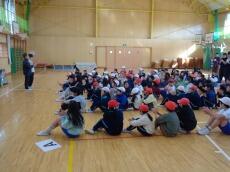 次に、冬休み中の過ごし方について話しました。「は・つ・ひ・の・で」を合言葉にどのようなことに気をつけて生活すればよいかを全校で確認しました。