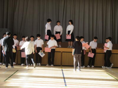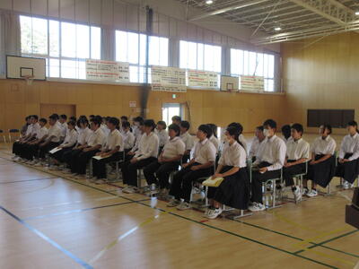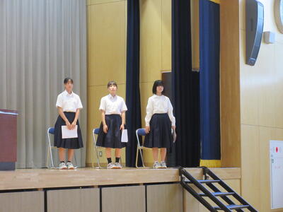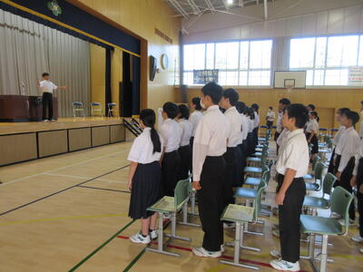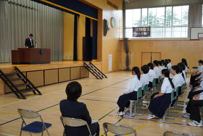 10月10日(金)前期終業式が行われました。全校合唱で、校歌をを歌い前期をやり遂げた達成感と、級友と共に歩んできた力強さを感じました。続いて、生徒代表による発表「前期を振り返って」が行われました。学習面や行事、部活動などそれぞれの場面での努力や成長を振り返りながら、友達の感謝の気持ちや後期への意気込みが語られました。聞いている生徒たちも、自分自身の歩みを重ねながら話を聞くことができました。前期の締めくくりとして心を整えることができた終業式になりました。後期も、一歩ずつ前進していけるよう、学校全体で支えていきます。