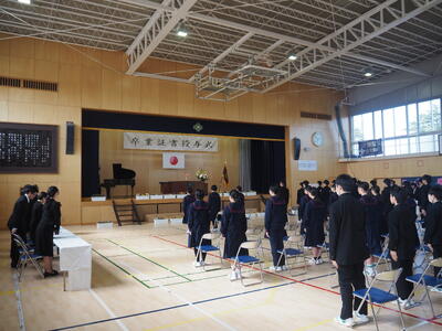 本日、令和7年度第79回卒業証書授与式が行われました。卒業生は堂々とした姿で式に臨み、在校生や保護者の皆さま、地域の方々に見守られながら、温かい雰囲気の中で旅立ちの日を迎えました。