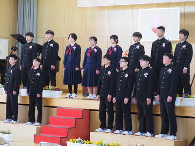 全校合唱「さよなら友よ」では、1・2年生の気持ちのこもった歌声が会場を包み、卒業生へのエールとなりました。卒業生が歌った「道」は、これまでの思い出と未来hの希望を感じさせ、多くの方々の心に深く響きました。