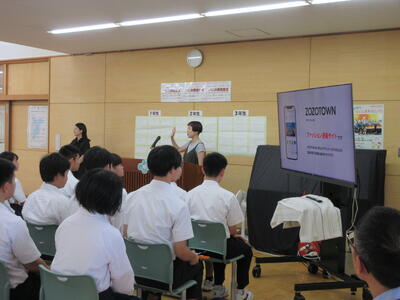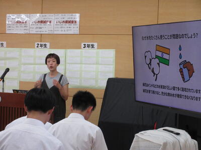 株式会社ZOZOより2名の講師をお迎えし、全校生徒を対象とし「ファッションと環境問題について」というテーマでキャリア教育講演会を実施しました。講義はクイズ形式やディスカッションを交えながら進行され、ファッション業界が抱える環境課題や自分たちのできること(持続可能な取り組み)について生徒同士積極的に意見を交わしました。