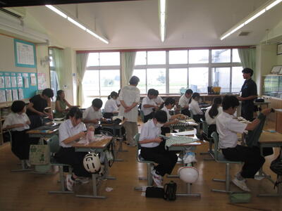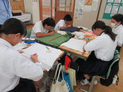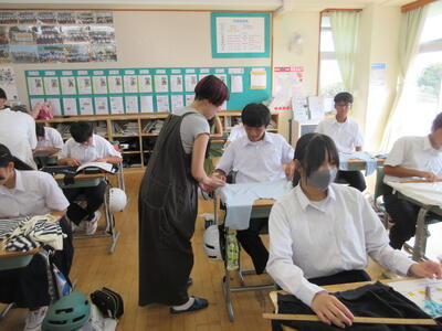 授業の後半では、着古したTシャツを使った「エコバック作り」に挑戦しました。自分だけのバックを手作りすることで、ものを大切にする心や創造性、ものに対する考え方を学ぶ良い機会となりました。保護者の方も4名参加してくださりました。