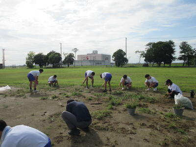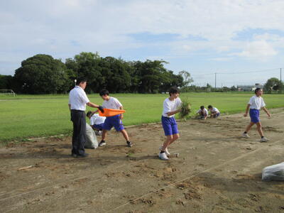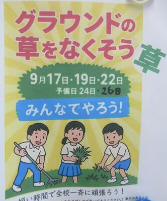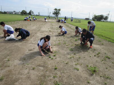 本日、清掃の時間を活用して、グラウンドの草抜きを行いました。わずか10分程度の作業で詩型、各学年が力を合わせて取組学年対抗形式で楽しく競い合いました。