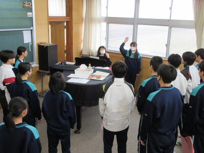 2年生の音楽は(各学年もそうですが)卒業式に向けての合唱の練習を行いました。発声のためのウォーミングアップのあと、指揮者の指揮で歌の練習を行いました。当日は立派な歌声を期待します。がんばれ2年生!
