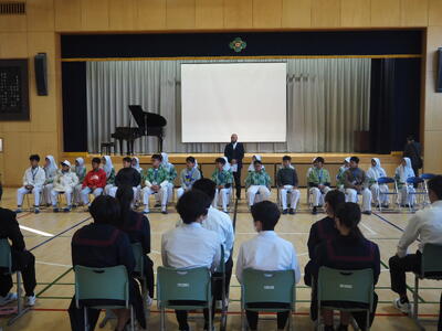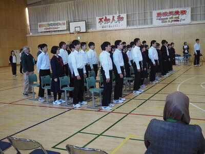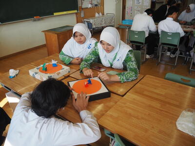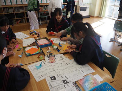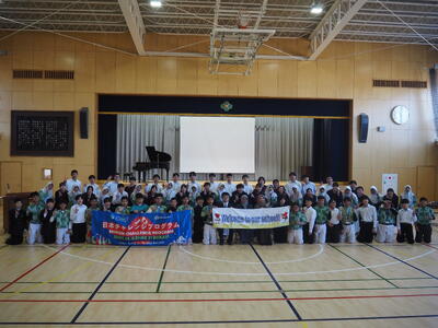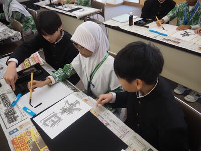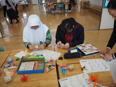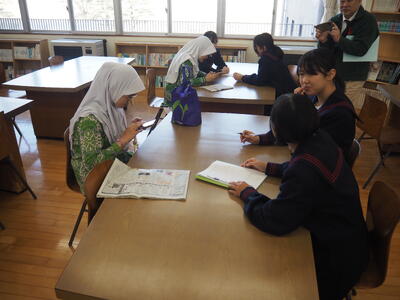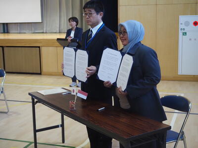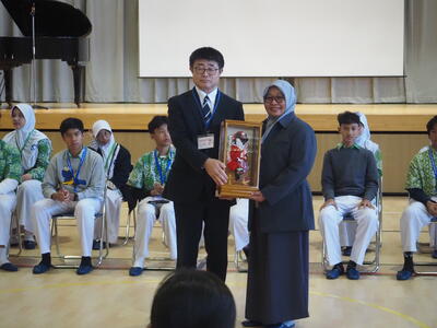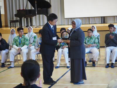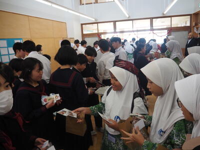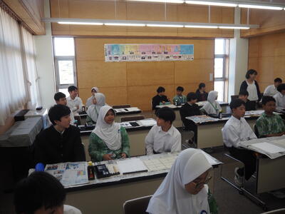11月27日(木)、本日、本校にインドネシアからの中学生を迎え、国際交流会を開催しました。言葉や文化の違いを超えて、笑顔で交流を行うことができました。歓迎セレモニーでは、学校間の調印式と記念品の交換、両校の生徒による合唱が行われました。英語、日本語、インドネシア語で行われました。その後は、書道、折り紙、伝統遊びなどの体験活動を行い、体験活動を通じて心が通い合う場が多く見られました。言葉や文化以外にもコミュニケーションの取り方など、たくさんのことを学ぶとても良い機会となりました。