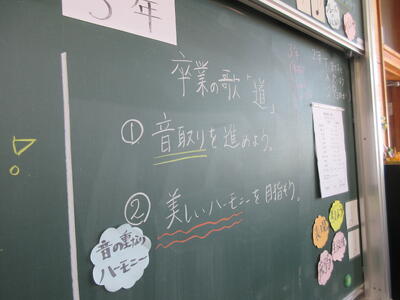 <3年生…音楽> 卒業の歌「道」の練習が始まりました。各パートでCDを聞きながら音とりの練習をしていました。