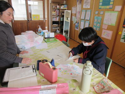 <2年生…英語、技術> 1月に香取市姉妹都市であるサイパン市の学校とのオンライン交流があります。そのためのPP作り(学校/香取市の紹介)をALTと共に頑張りました。