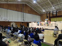 今日は、劇団「風の子」の皆さんをお迎えし、芸術鑑賞会を開催しました。「ちぇんじ・図書室のすきまから」という演劇公演です。子ども達の入場からすでに劇は始まっており、役者さんたちの案内でみんなが席につきました。保護者の方や地域の方も同じです。全員があっという間に物語の世界に引き込まれていきました。歌あり、ダンスあり、サプライズで担任の先生の登場ありと、楽しい仕掛けが次から次へと繰り出されながら進んでいく物語。涙が出るほど笑う部分もあるけれど、自分の言葉で本当のことを言う勇気の大切さ、自分を好きでいることがどれだけ大事なのかということなど、力強いメッセージが心に迫って来る、そんな公演でした。一人一人が「勇気」をもらって体育館を後にしていたように思います。素晴らしい芸術の秋を味わう一日となりました。