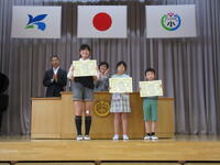 始業式の後には、席書会や絵画コンテスト、人権標語展などに入賞した児童への賞状伝達が行われました。