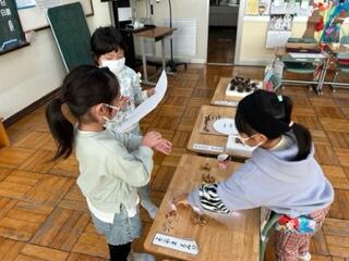 1年生は「秋まつり」の準備でしょうか? 平成の森で拾ってきた木の実や小枝などを使っていろいろなゲームを作っていました。おなもみダーツやけんだま、やじろべえ、こま、小物、迷路などです。今日は、お店屋さんとお客さんの2グループに分かれて、やり取りの練習です。とくに、お店屋さんはゲームのやり方を上手に説明しなければなりません。かわりばんこに役割分担して、みんな上手に説明することができました。