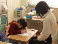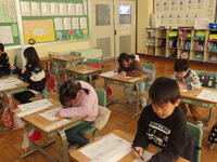 さて、本校では、1年生と2年生が硬筆、3年生以上が毛筆に取り組みました。どの学年の児童も頑張っていましたが、特に3年生以上は、11月下旬に前校長海寳先生にご指導いただいたことを思い出しながら、集中して筆を運んでいました。また、冬休み中によく練習をしてきた児童が多く、練習の時よりも一段と上手になっていました。