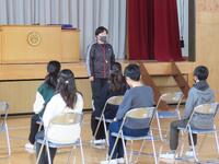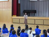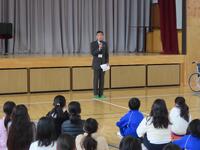 今日は、児童企画・運営委員会主催の全校集会8回目を行いました。まだ月初めなので2月の歌「大切なもの」は次回のお楽しみとして、今日も元気よく、「天使の羽のマーチ」を歌いました。軽快なメロディに「誰にでも未来をつくる力がある」というメッセージが込められたこの歌は、歌う者、聴く者を元気にさせます。そして、全校集会恒例、先生方のお話リレーは、養護教諭の神﨑先生の番です。神﨑先生は、「『〇〇ない…』を『ナイス!』に変えよう」というテーマで児童の望ましい生活習慣について話をしてくれました。「朝ごはんをたべない」をやめて「ナイス!」、「こたつでゴロゴロ、運動しない」をやめて「ナイス!」というように、生活習慣を整えることに意識を向け、健康的な生活を送ることの大切さを分かりやすく説明してくれました。児童も身近な課題として、集中して話を聞いていました。