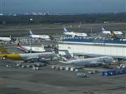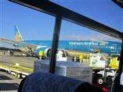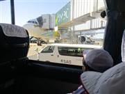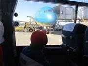 次に、駐機スポットをバスでまわりました。間近でみる機体の大きさに子どもたちは興味津々です。エンジンや翼の形が一つ一つ違うことを知りました。
