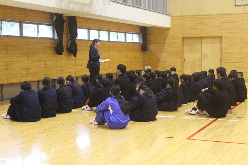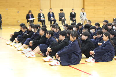 転出される先生方お一人お一人からの最後のご挨拶では、山田中学校での思い出や、生徒たちの未来に期待を寄せる温かいメッセージをいただきました。式の間、生徒たちは別れを惜しみつつも、先生方の言葉を一言一言かみしめるように真剣な表情で聞き入っていました。
