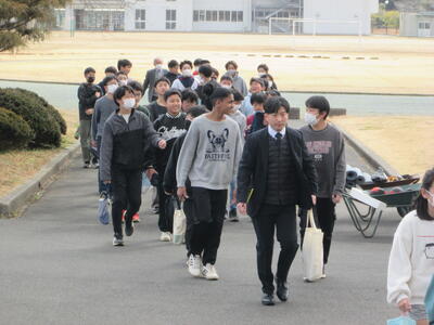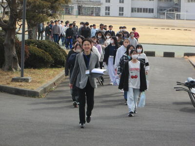 昨日の検査を終え、少し安堵した表情の中にも、最後までやり抜こうという強い意志を秘めて会場へ向かう本校受検