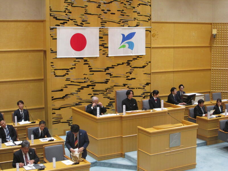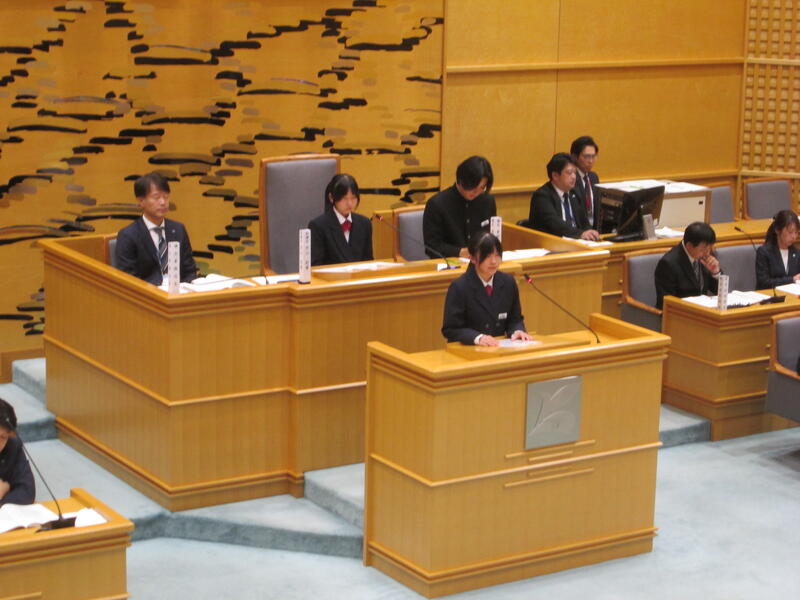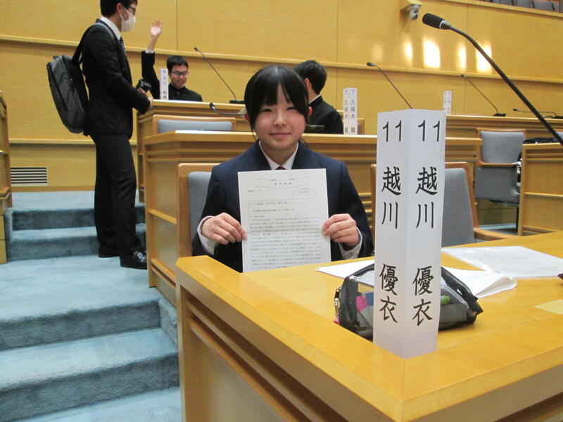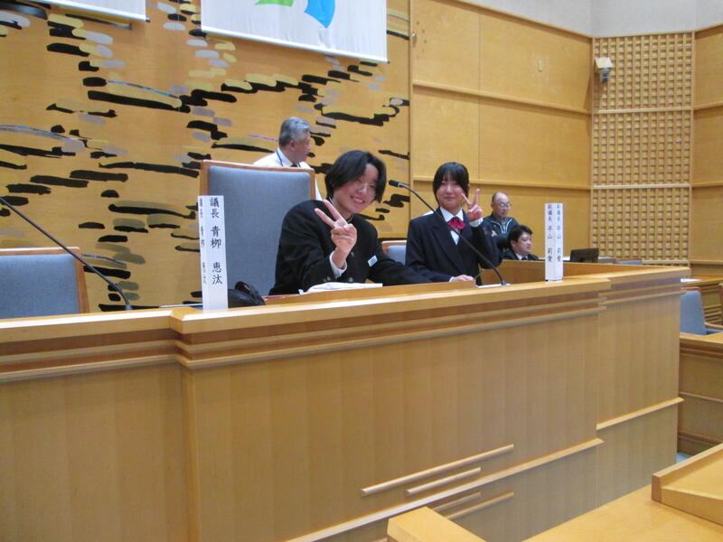 本校の青柳恵汰前生徒会長・越川優衣前副会長が、山田中学校代表として、中学生議会に参加しています。