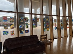 2年生が美術の授業で制作していたステンドグラスシートが完成し、小さな美術館のガラス面に並びました。